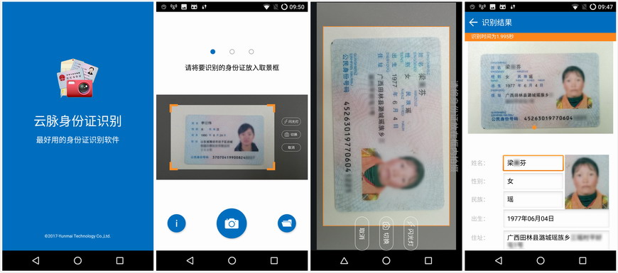云脉身份证识别SDK适用于证券银行等金融机构自助开户、保险展业与移动查勘、运营商实名制开卡与无纸化营业厅、公安 交警移动警务通等行业的合作伙伴集成开发。